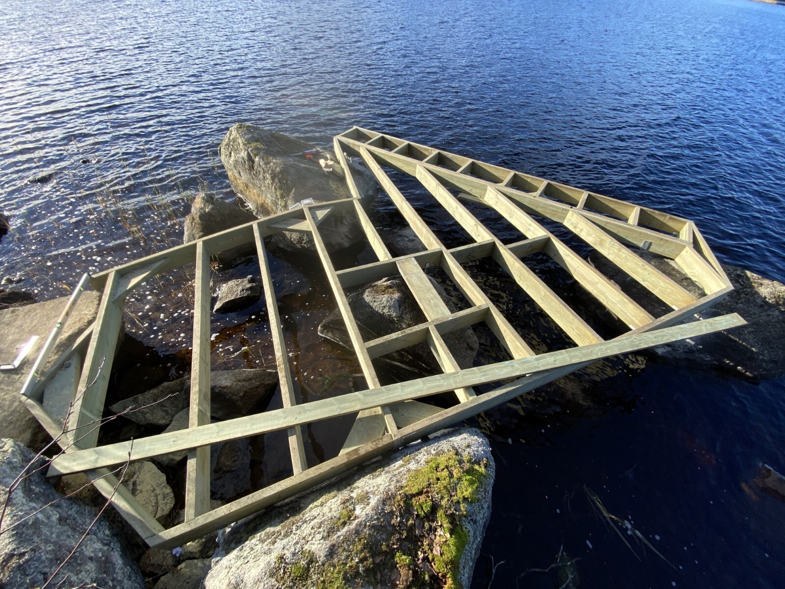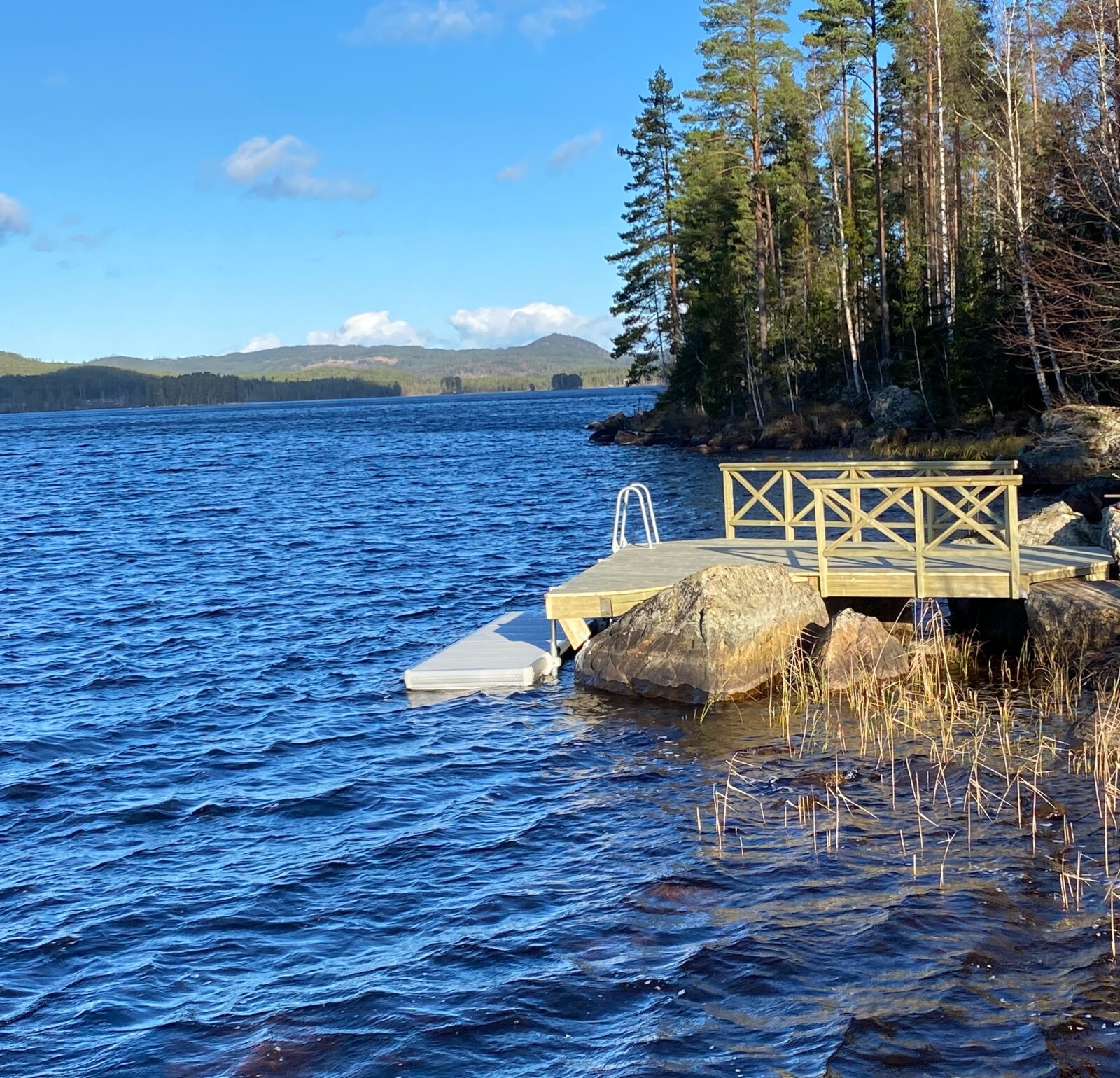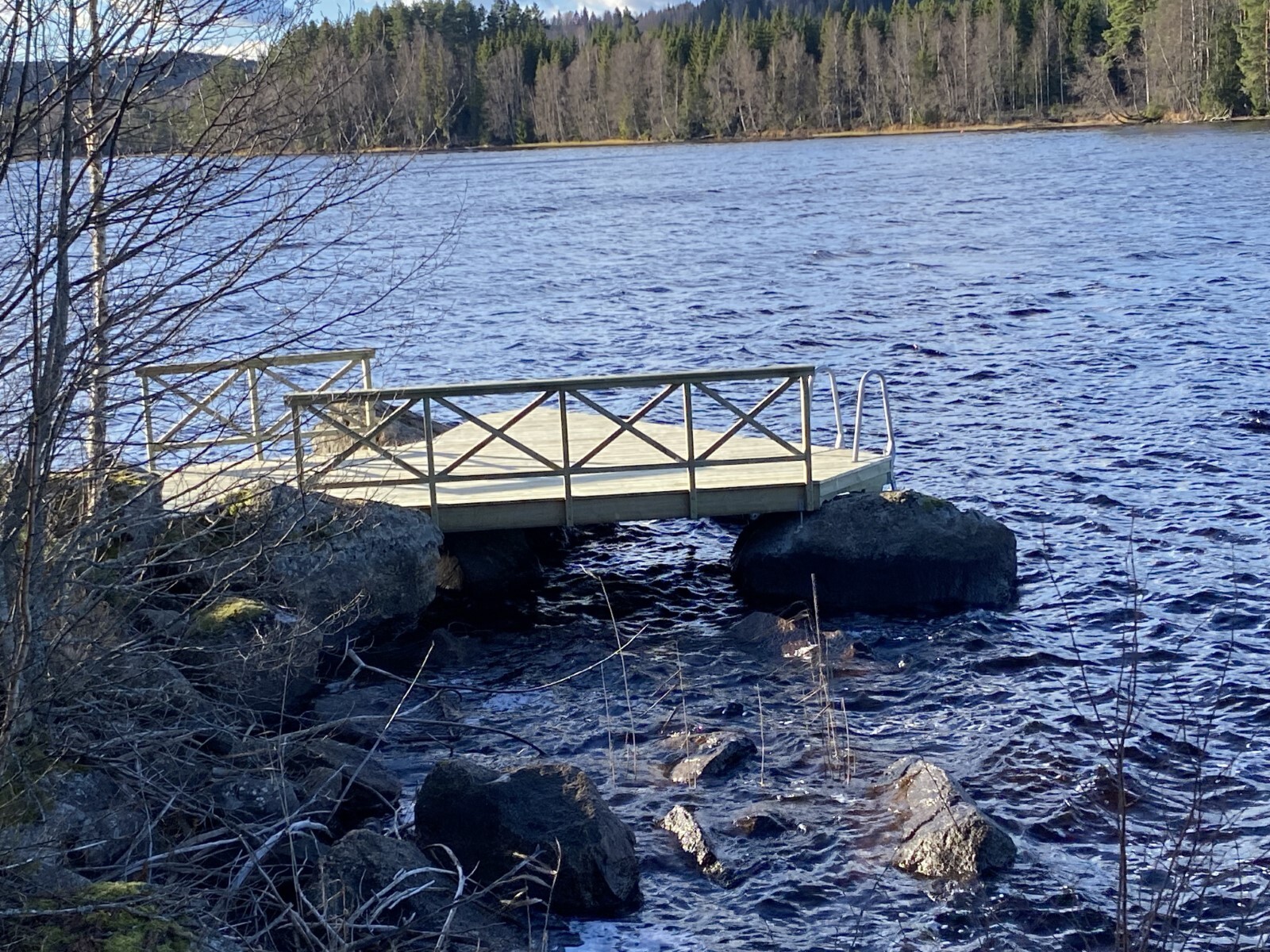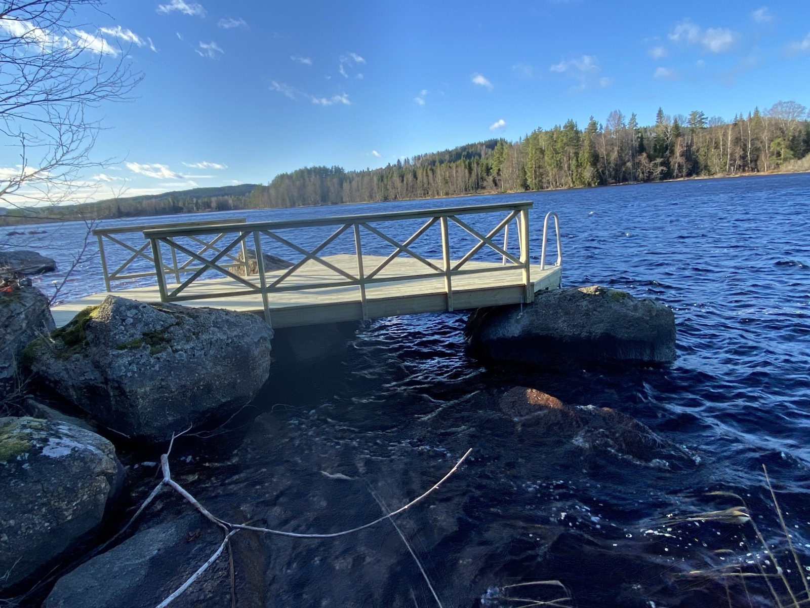 Her har vi levert og montert en kombinasjon av fastbrygge med trerekkverk, utforming av kryss, og en liten flytebrygge til en privatkunde i Finnskogen.