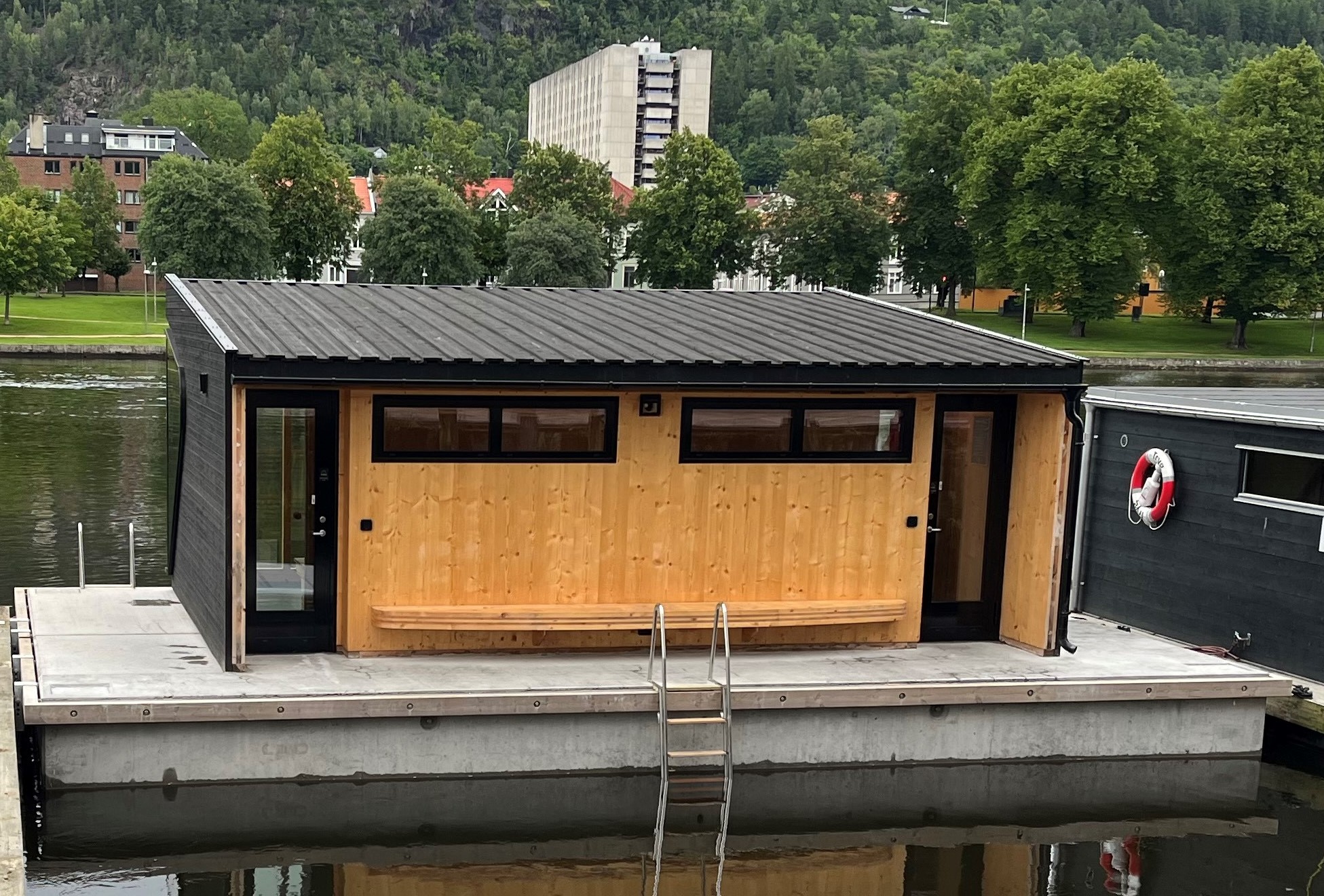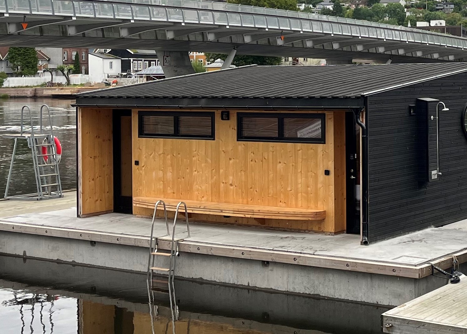 Ælvebadstua har fått en flott badstue som ligger flytende i Drammenselva. Nordocks har levert og forankret det flytende elementet i betong. Dette er 10 meter langt og 6 meter bredt, med et fribord på ca. 0,7 meters høyde. I tillegg monterte vi 3 syrefast badestiger med 4 tretrinns.