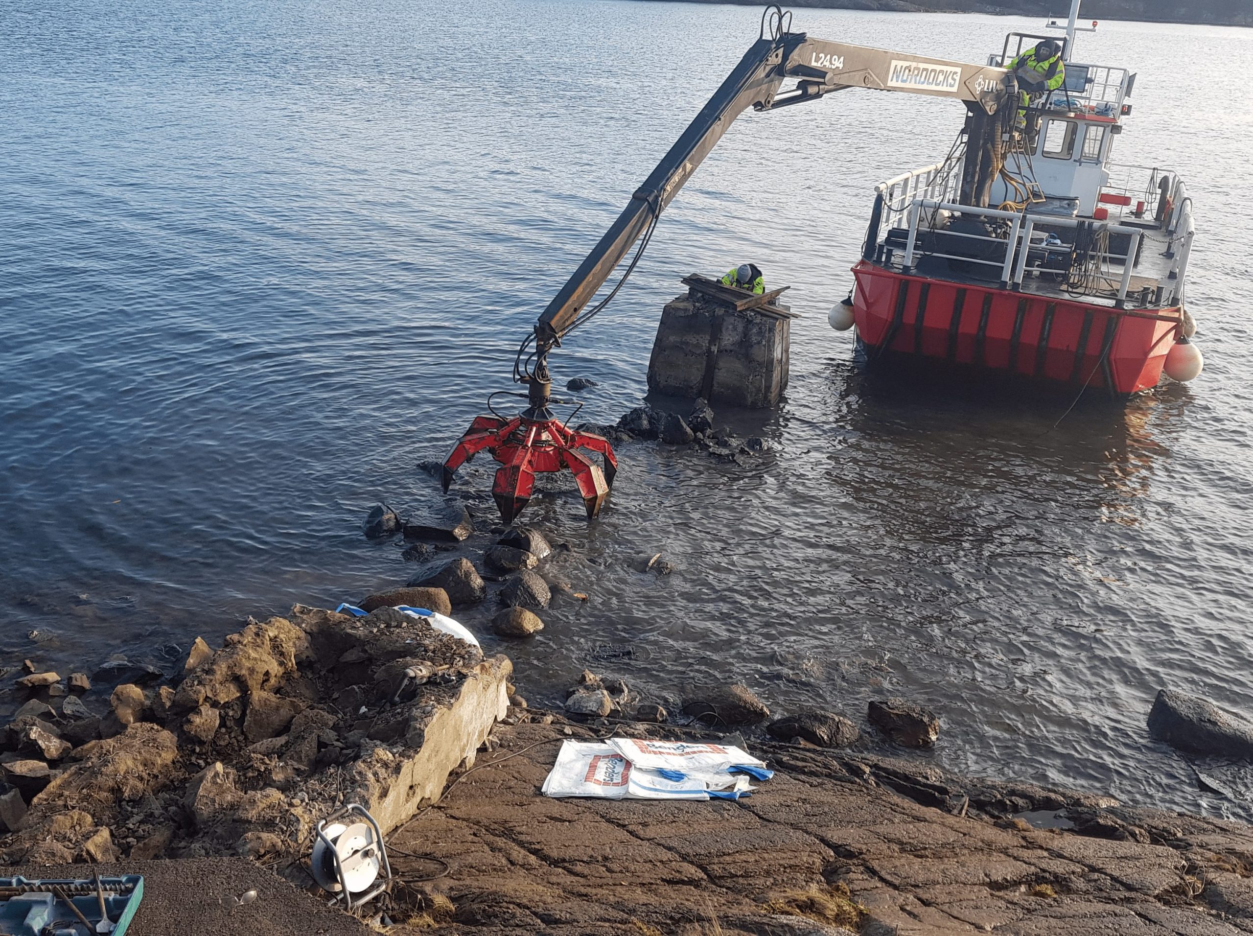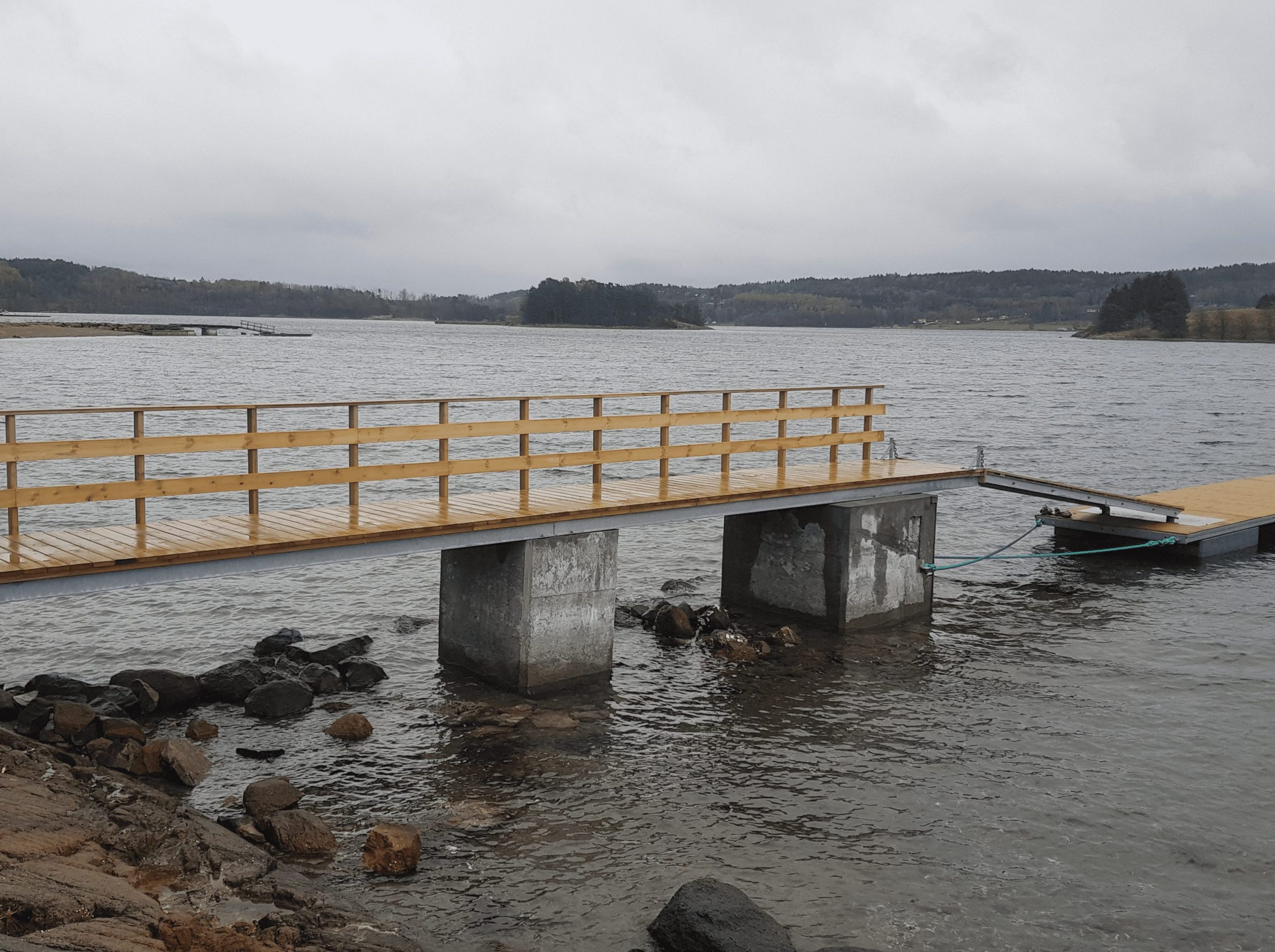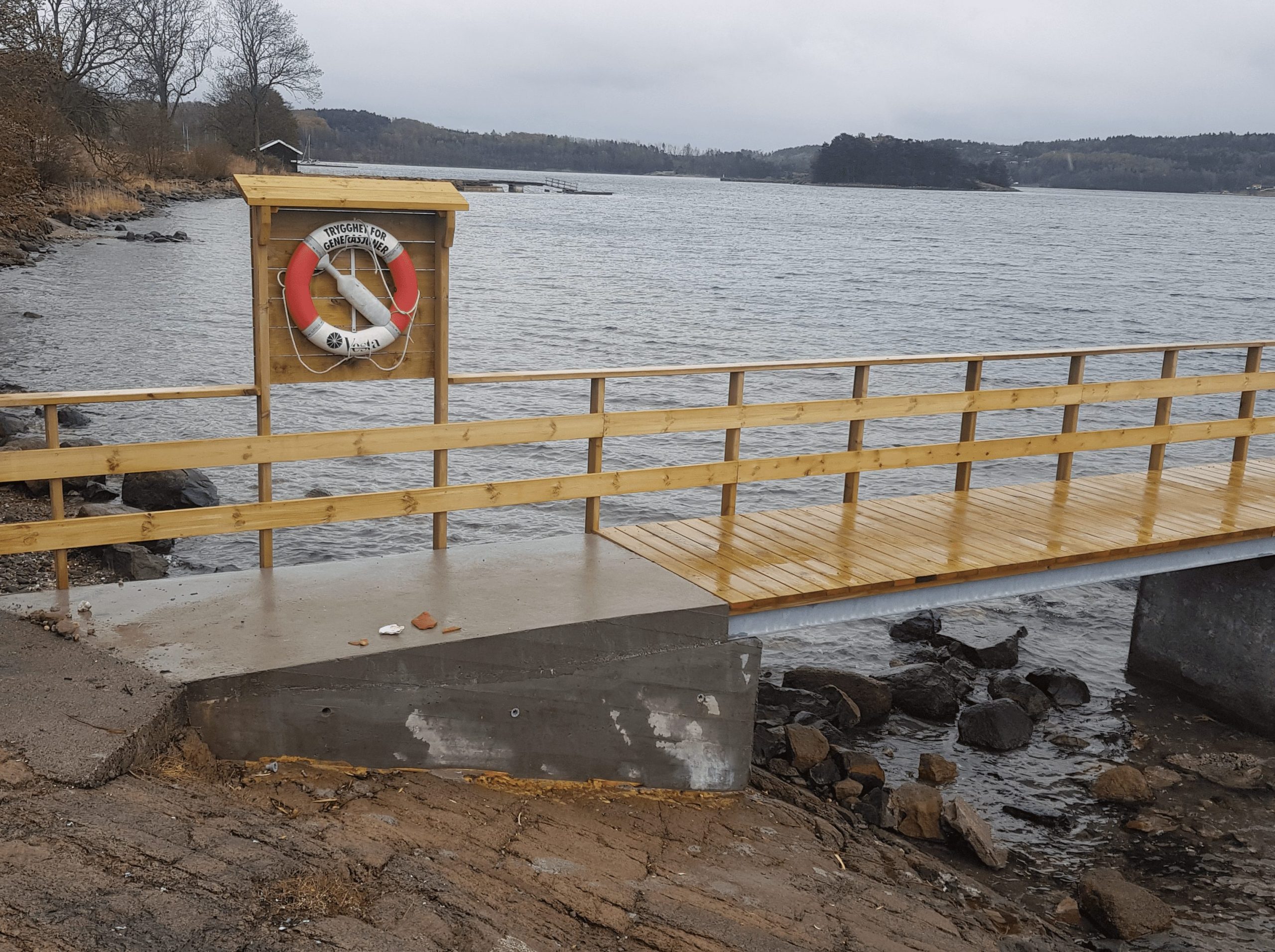 Vårnes badebrygge – rehabilitering Kort beskrivelse om prosjektet ============================== Rive eksisterende brygge. Støpe nye fundamenter. Montere ståldragere og tredekke. Levere flytebrygge.